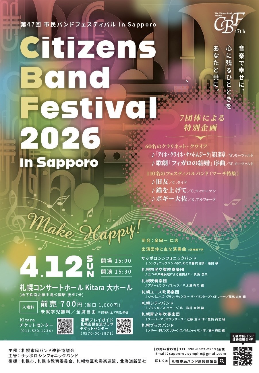 ・4月12日、第47回市民バンドフェスティバル in Sapporoに参加します。![]() 詳細はこちらにて。 |